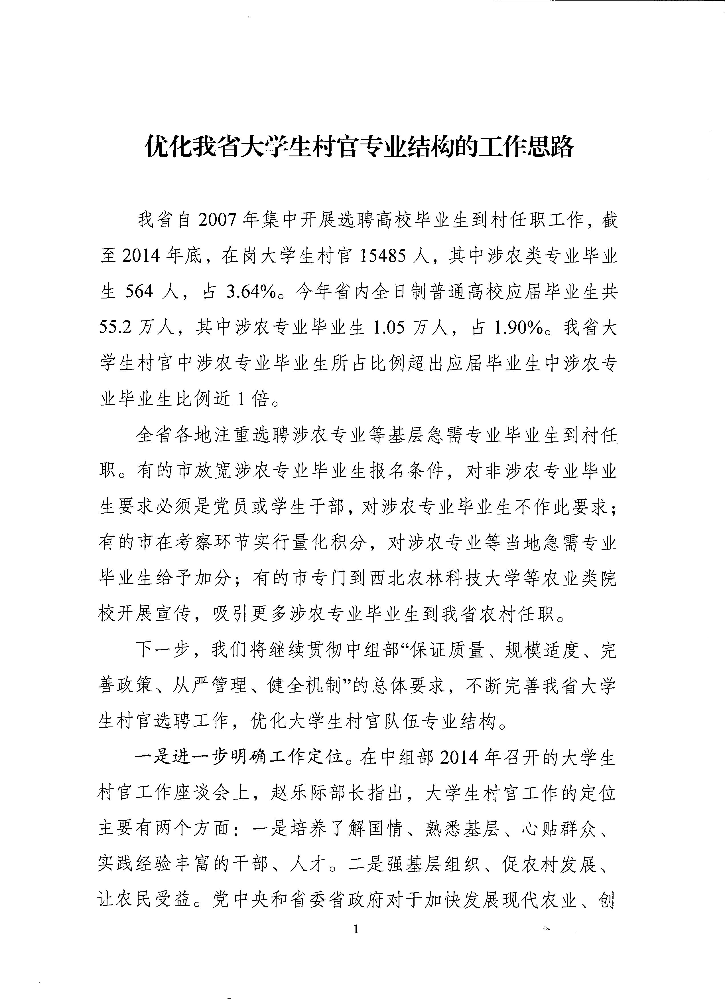 省委领导和部领导要求,我们对建议进行认真学习研究,对全省大学生村官专业结构、选聘情况进行了调研分析,提出了优化我省大学生村官专业结构的工作思路