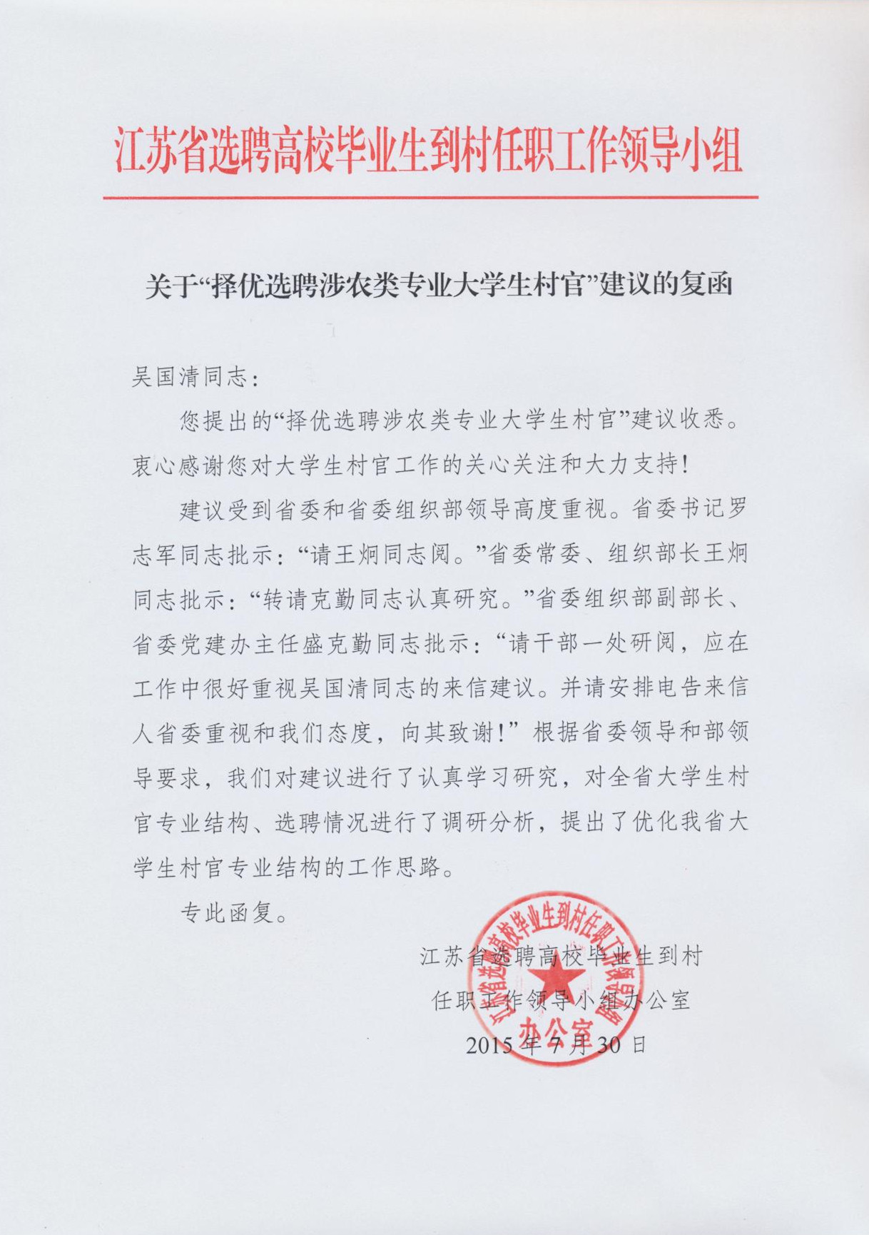 党办收到江苏省委组织部函件。函件全文如下(附扫描件):