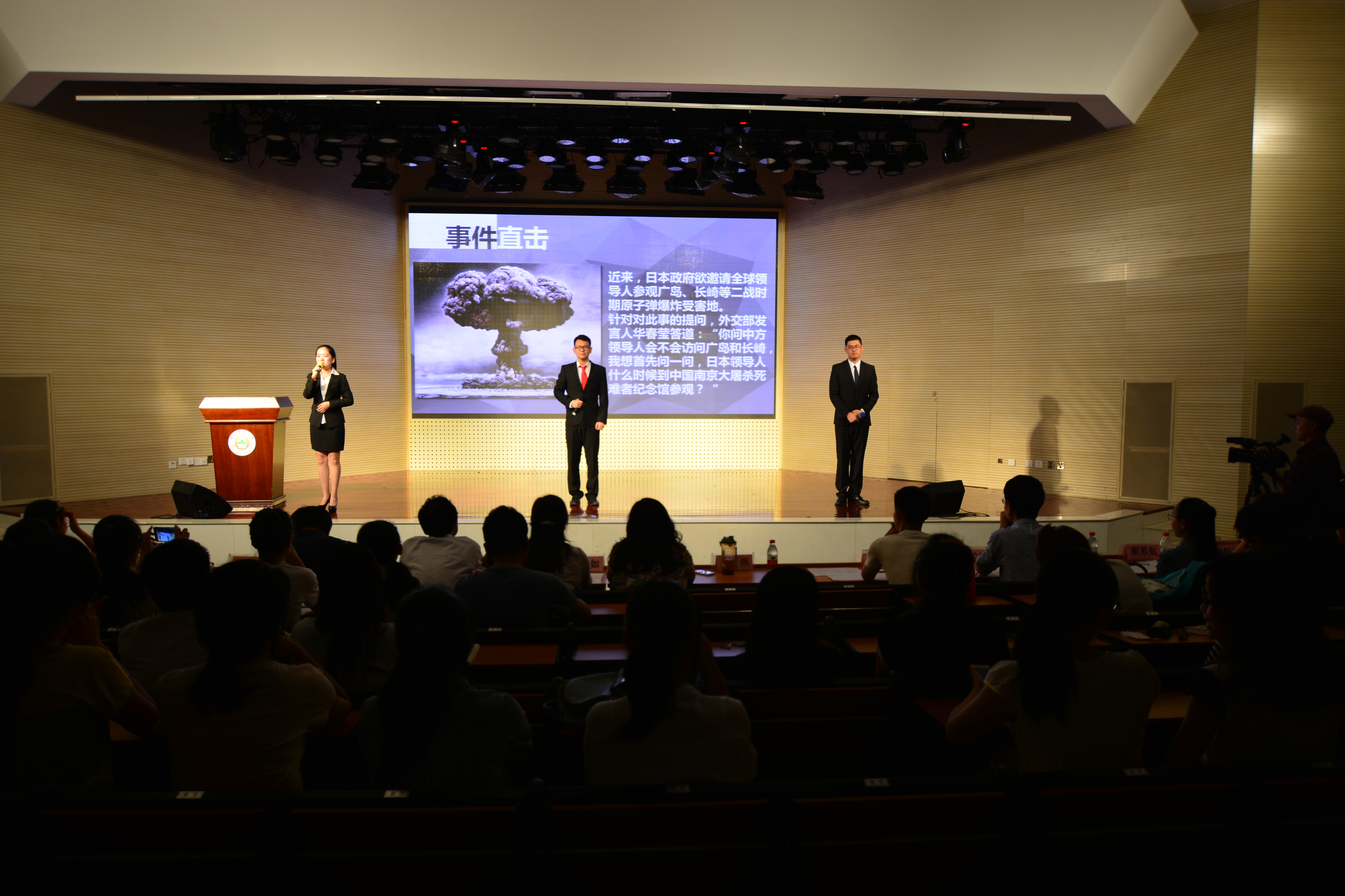 比赛在主持人精彩的开场白中拉开帷幕。在演讲过程中,同学们紧扣“反思抗战”这一主题,有的从重读抗日战争胜利所体现出来的民族精神出发,让我们坚定了弘扬伟大民族精神的信念;有的从文化共识角度反思日本为何在近代能侵略中国,让我们认识到日本侵略中国的文化根源;有的从南京大屠杀血与泪的教训出发,激发了我们反思伟大胜利背后所承载的血与泪……活动现场气氛热烈,选手们真情流露,充分展示了当代学生的爱国热情。一段段声情并茂的演讲,把演讲比赛一次次推向高潮,也迎得了现场观众的阵阵掌声。