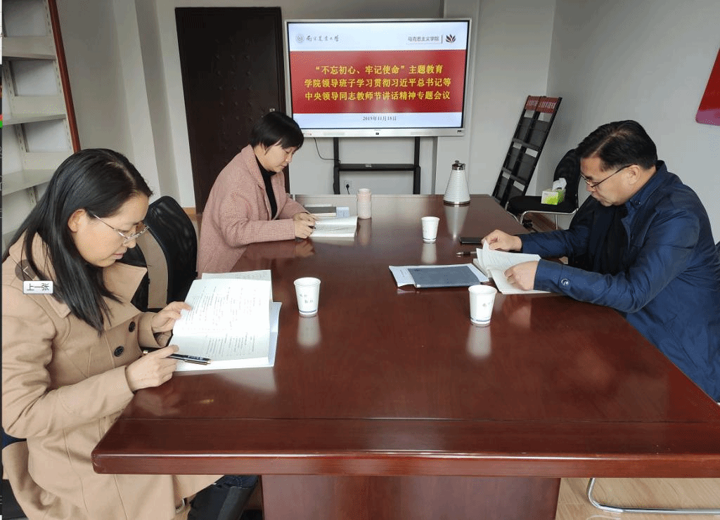 11月18日下午,18porn 在学院305会议室召开在“不忘初心、牢记使命”主题教育学院领导班子学习贯彻习近平总书记等中央领导同志教师节讲话精神专题会议。学院党总支书记、院长付坚强,党总支副书记杨博,副院长姜萍会议。会议由付坚强主持。