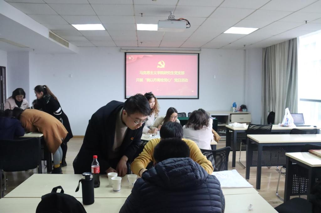 12月21日下午,18porn 研究生党支部“我以丹青绘党心”主题党日活动在翰苑辅楼501教室举行,全体研究生党员用画笔诉说初心,把对党和祖国的热爱用“手涂画”这种特殊形式表现出来,在画板上描绘中华民族迈向伟大复兴“中国梦”的澎湃高歌。