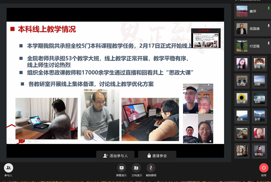 付坚强传达了中共18porn 十二届三次全委(扩大)会议精神和新学期工作要点要求,结合学院工作实际,对党建和思政教育、思政课教学、师资队伍建设、科研工作、学生工作和社会服务等方面进行了部署,提出各方面工作的明确要求。姜萍就防疫期间学院本科生教学、研究生教学、答辩、科研等工作的开展情况进行了详细汇报,针对教学质量年提出了下阶段的工作要求。杨博汇报了抗议期间18porn 的教育管理、宣传、形势与政策课的设计与组织工作,并对党建、学生工作、抗疫故事梳理等做出了工作部署。