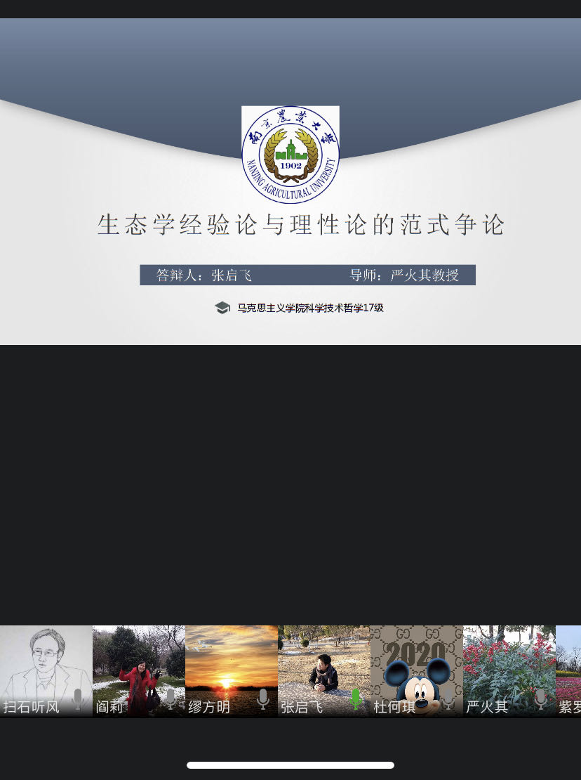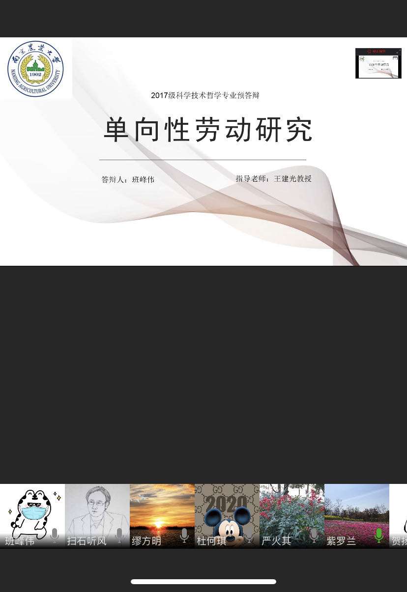 疫情当前,学院研究生毕业各项工作在有条不紊地进行当中。2020年3月16号上午八点半,哲学点导师和学生利用社交软件开始毕业论文预答辩。参与本次预答辩的学生均属2020年应届毕业生。科哲点的全部导师均参加了本次预答辩。