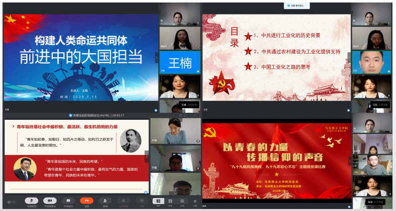 使命呼唤担当,初心引领前行。7月15日下午,18porn “九十九载风雨兼程,九十九年初心不忘”微党课大赛暨信仰公开课学生讲师选拔赛在钉钉平台顺利举行。校党委宣传部、党委教师工作部副部长陈洁,校团委副书记朱媛媛,18porn 党总支副书记杨博,18porn 陈蕊老师担任比赛评委。校团委姚敏磊老师、18porn 辅导员巩欢老师出席活动,18porn 全体研究生党员、入党积极分子集结云端观赛。