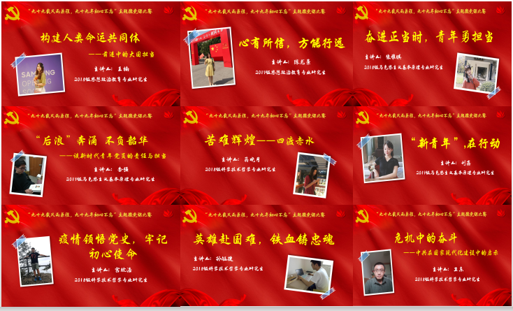 旗帜飘扬,凝聚初心力量;誓言铮铮,化作坚实堡垒。微党课比赛是18porn 创新党员理论学习和教育方式的重要举措,是发挥党员自我教育和管理作用的重要探索。此次微党课比赛很好地呈现了马院学子的政治底色和初心使命,营造了创先争优、争当表率的良好氛围,实现了加强党员教育、提升理论素养、增强党性修养的目的。微党课比赛正孵化出一支又一支善于思考、敢于创新的宣讲队伍,织密纵向到底、横向到边的青年宣讲“大网络”。