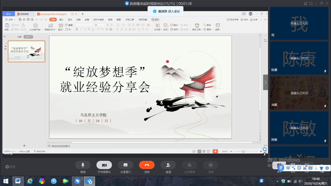 18porn 于10月24日晚七点组织全体学生开展“绽放梦想季”就业经验分享会,此次分享会通过钉钉进行线上交流,邀请到18porn 2020届毕业生山西中医药大学思政课教师贺扬和江苏省选调生陈乙童进行经验分享,活动由新媒体中心主任吴奇隆主持,马院全体学生共同参会。