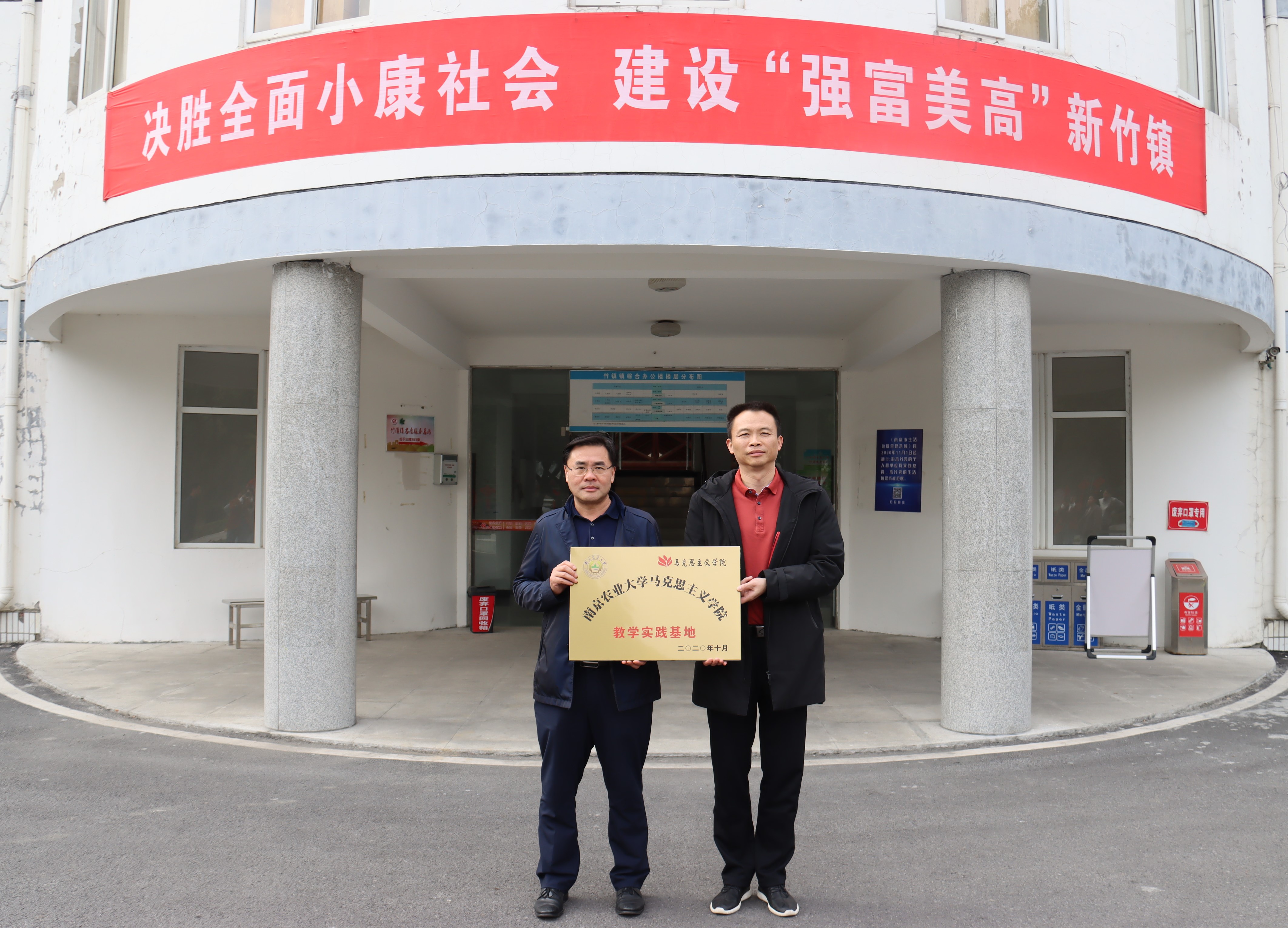 11月16日,18porn 赴南京市六合区竹镇镇开展教学实践基地共建活动。竹镇镇孙鲁阳、18porn 院长付坚强、院党总支副书记杨博、副院长姜萍、思想道德修养与法律基础教研室主任张金明及部分师生代表参加了揭牌仪式。