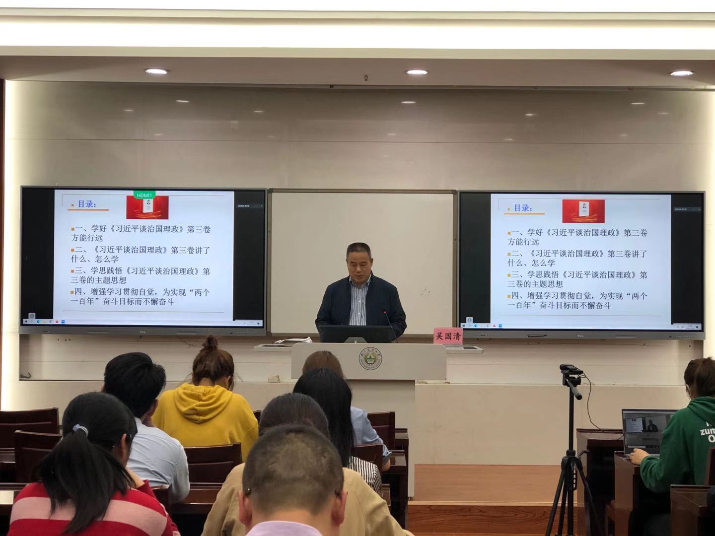 宣讲员成员紧密围绕学校中心工作与特色亮点,有针对性地将“四史”教育、《习近平谈治国理政》第三卷和党的十九届五中全会精神与我校教学科研、人才培养、社会服务、文化传承等相关领域结合起来,与学校第十二次党代会确立的主要奋斗目标与重点工作结合起来,与当前时政热点和新时代的发展方向结合起来。从脱贫攻坚与乡村振兴、到美丽中国建设,再到“十四五”期间我国发展的主要指导方针、主要目标、重点任务、重大举措,宣讲内容全面翔实、重点突出,带领师生深刻认识习近平新时代中国特色社会主义思想的时代意义、理论意义、实践意义、世界意义,有效地推动思政宣传与理论教育走深、走实、走心。