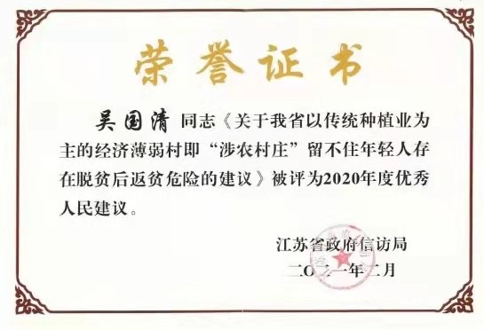 近日,18porn 教授吴国清教授《关于我省以传统种植业为主的经济薄弱村即“涉农村庄”留不住年轻人存在脱贫后返贫危险的建议》被江苏省政府信访局评为“2020年度优秀人民建议”。