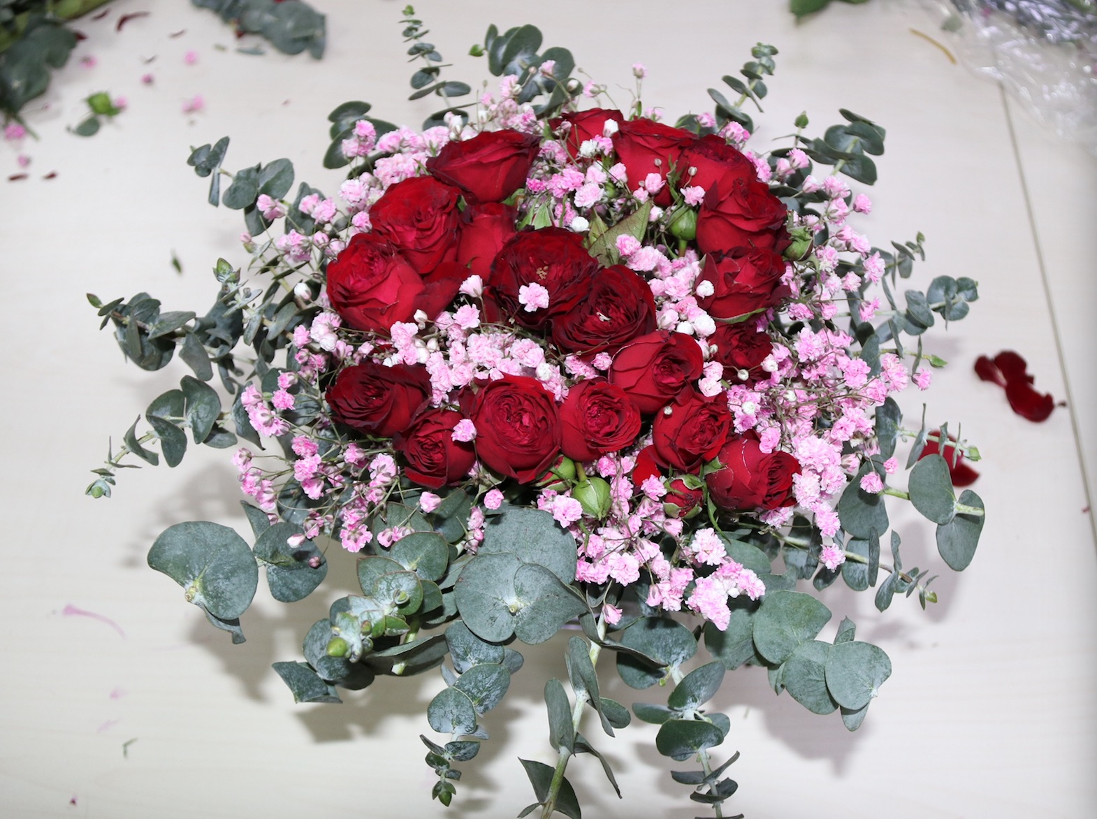 正午时分,活动现场已经摆上了各种品种的鲜花,浓烈炽烈的玫瑰花,纯洁庄严的百合花,祝福洋溢的康乃馨,温暖陪衬的满天星,情谊不变的勿忘我,配合各种绿意盎然的配草、手工制作的藤编花篮......活动现场花海郁韵,阵阵芬芳。
