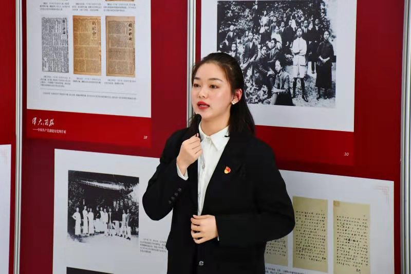 在团日活动的开始,马院研究生分会主席、党史讲解员刘蓓在党史图片展现场为青年师生进行参观讲解。她从中国共产党创建的历史背景说起,结合数百张珍贵的图片史料,分3个篇章,系统、全面地介绍了中国共产党的创建历史和建党艰苦历程,展示了中国共产党从弱小走向强大,重温了中国共产党的初心与使命,在场的青年师生都深受触动。