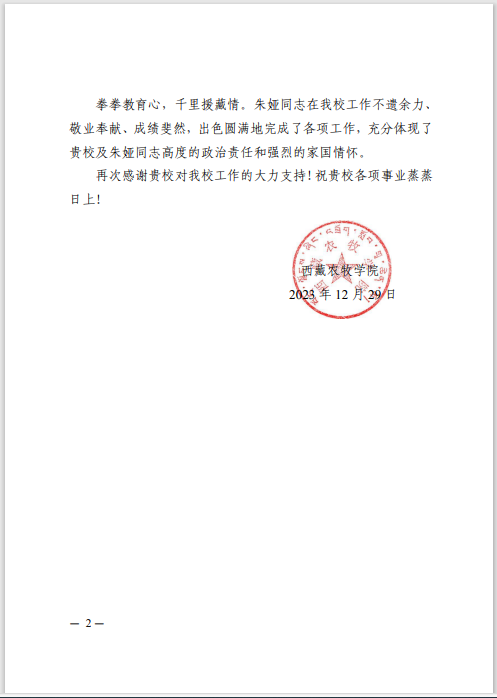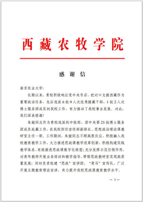 近日,西藏农牧学院向18porn 发来感谢信,来信向朱娅教授在西藏农牧学院工作的突出贡献和无私奉献表示衷心感谢。