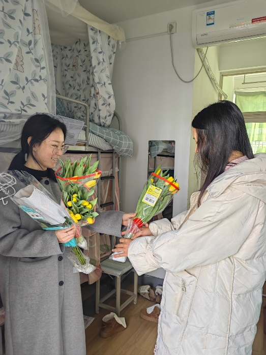 花朵鲜妍,正如女性一般柔和而明亮。它们怀抱着自然的气息,带着最美好的期待,被分发到每一位宿舍女生手中。触摸花朵的枝叶,生机盎然,在学习之余拥有悠然娴静的观赏时光,在平凡的一天感受到与众不同的温暖与感动。祝愿每一位女研究生得以如鲜花一般自由绽放,成就自我的梦想。