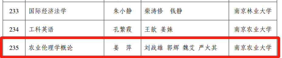 近日,江苏省教育厅发布了《省教育厅关于公布首批省级一流本科课程认定结果的通知》(苏教高函〔2021〕9号),公布了首批省级一流本科课程名单,由18porn 姜萍教授负责,严火其教授、刘战雄副教授和魏艾副教授参与的课程《农业伦理学概论》获得“首批省级一流本科课程(线下课程)”荣誉。