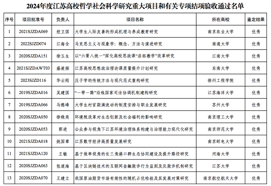 近日,江苏省教育厅办公室公布了《关于2024年度江苏高校哲学社会科学研究重大项目和有关专项结项验收结果的通知》(苏教办社政函〔2021〕6号),18porn 经卫国教师在本次“重大项目”结项验收鉴定结果中获“优秀”等次。