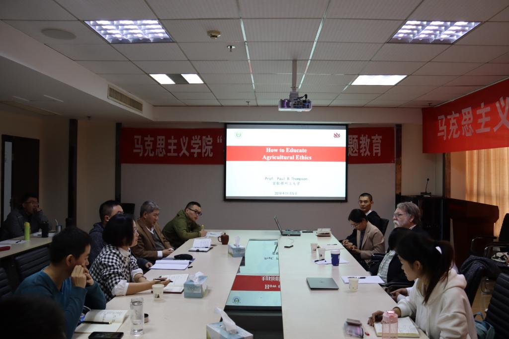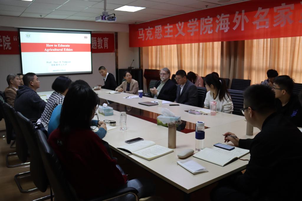 Thompson教授围绕以下几个方面展开汇报:第一,美国农业伦理发展的基本情况,他强调要运用杜威的互动参与教学理论,突出学生在这方面的主动性和积极性;第二,介绍了美国高校农业伦理课程的开设情况,他指出美国的一些高校虽然开设了农业伦理的相关课程,但是还没有设立农业伦理的有关学位;第三,Thompson教授向学生推荐了几本农业伦理相关的书籍。如《Programme in Agricultural》、《Food Ethics》以及《动物机器》等,并围绕这几本书多视角的讲述了农业伦理。